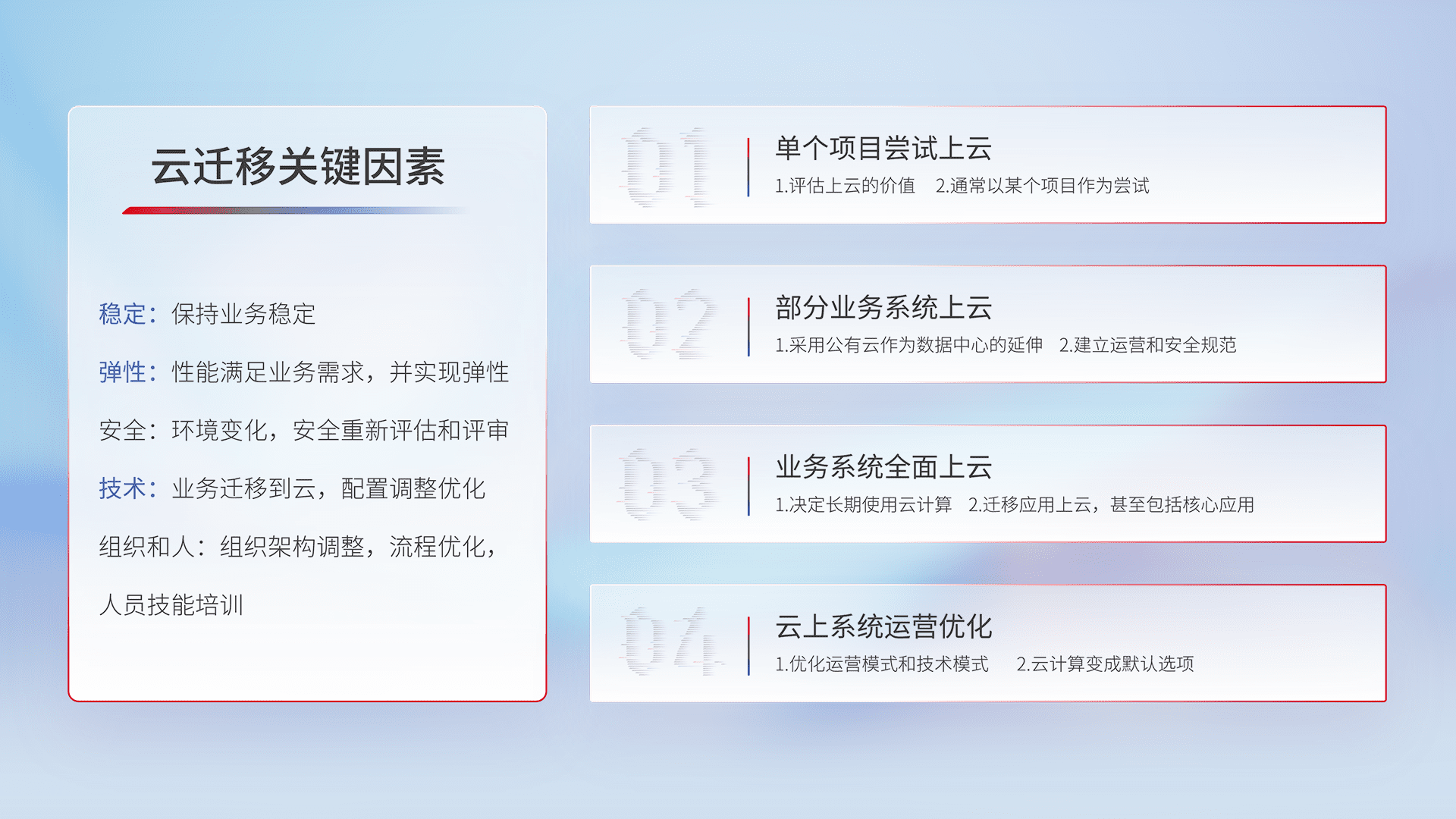 结合实际业务,,,,从规划设计、、、云平台选型、、、、云原生改造、、、、数据迁移、、、、集成交付,,,,迁移全过程为客户识别最佳上云路径,,做好风险识别管理,,,设计网络架构、、、、身份权限、、、、安全审计合规、、操作审计、、日志审计、、监控告警策略、、多站点容灾设计等,,,对云上基础设施进行整体规划,,提升IT治理水平,,,,以满足弹性、、、、高可用、、、、高性能的需求。。。。