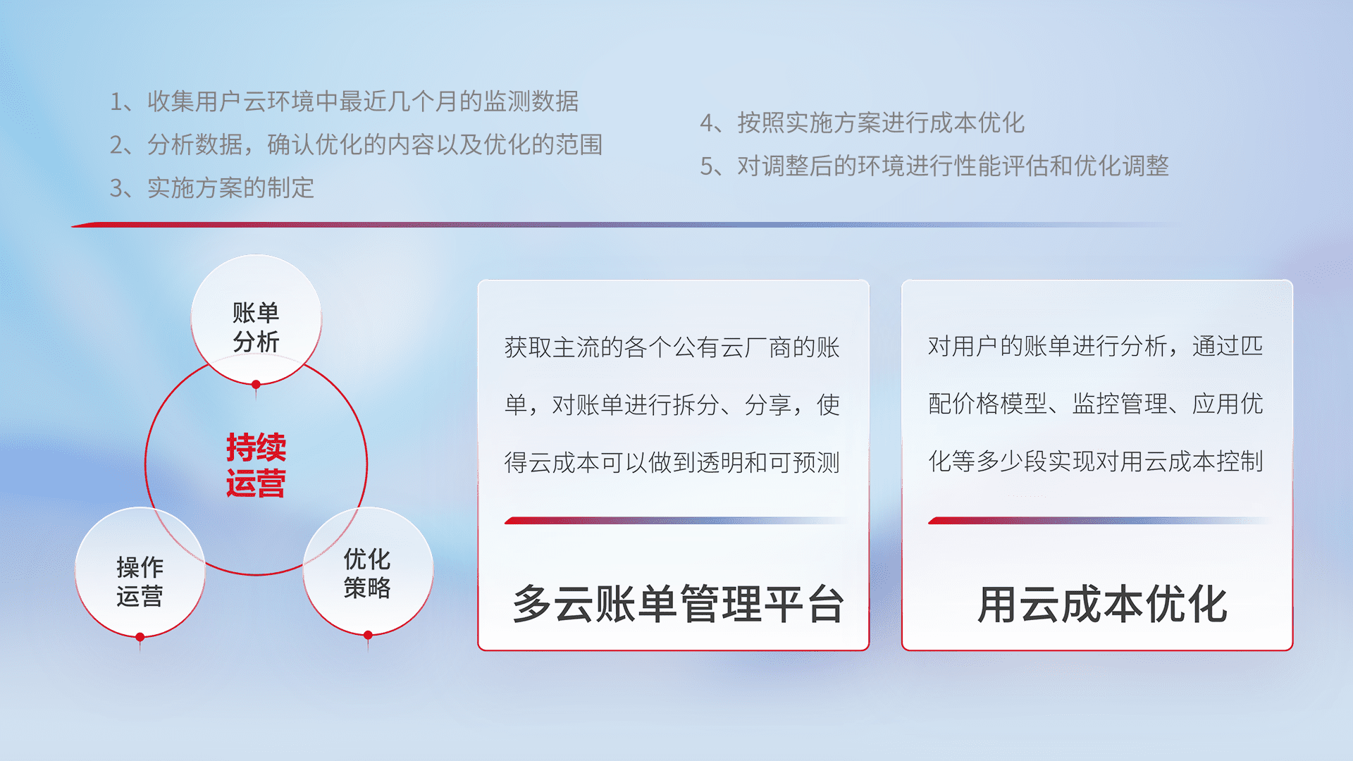通过多云纳管,,,,以统一的资源数据模型把客户的云资源进行抽象和封装,,,,进而实现对多云资源的统一操作,,,保障云资源管理的可靠性、、稳定性与可用性。。。。量身定制化运维内容,,配置、、开发运维、、、补丁管理、、备份、、、监控、、、认证和访问管理、、、审计和日常巡检等,,,,保障在用云过程中的可靠度,,稳定度以及高可用率。。
